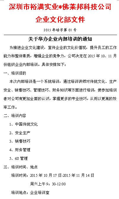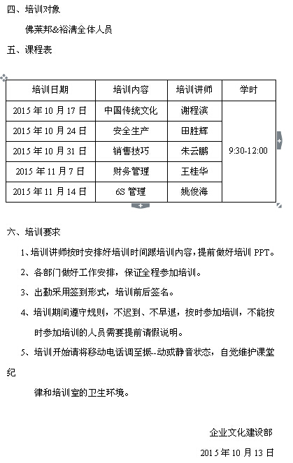 為推進(jìn)企業(yè)文化建設(shè),宣傳企業(yè)的文化價(jià)值觀,提升員工的工作能力和整體素質(zhì),增強(qiáng)企業(yè)的競(jìng)爭(zhēng)力,裕滿決定在2015年10、11月份組織企業(yè)內(nèi)部培訓(xùn)。