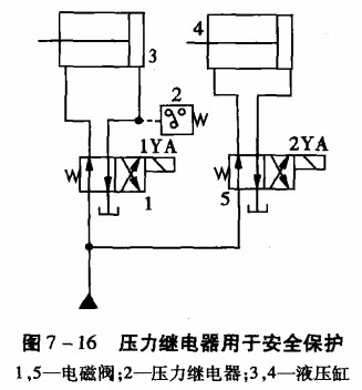 (1)用于安全保護(hù)。如圖7-16所示,將壓力繼電器2設(shè)置在夾緊液壓缸的一端,四柱油壓機(jī)液壓泵啟動(dòng)后,首先將工件夾緊,此時(shí)夾緊液壓缸3的右腔壓力升高,當(dāng)升高到壓力繼電器的調(diào)定值時(shí),壓力繼電器2動(dòng)作,發(fā)出電信號(hào)使2YA通電,于是切削液壓缸4進(jìn)刀切削。在加工期間,壓力繼電器2微動(dòng)開關(guān)的常開觸頭始終閉合。若工件沒有夾緊,繼電器2斷開,于是2YA斷電,切削缸4立即停止進(jìn)刀,從而避免工件未夾緊被切削而出事故。