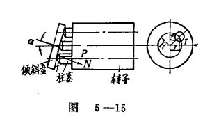 軸向柱塞泵和軸向柱塞馬達在結(jié)構(gòu)上是相似的。軸向柱塞馬達的工作原理見圖5-15,F(xiàn)以帶有傾斜盤的液壓馬達為例,說明其工作原理s處在進油腔的柱塞受到液壓力時,向左頂出。同時,傾斜盤對柱塞有一反作用力N,該力垂直斜盤平面,并可以分解為兩個分力t一個為軸向分力P,它和柱塞所受的液壓力平衡s另一力T與柱塞軸線垂直,官使轉(zhuǎn)子產(chǎn)生扭矩。假如認為馬達的排油腔壓力可以忽略不計,液壓馬達的輸出扭矩,就成為進油腔所有桂塞產(chǎn)生的扭矩之利。