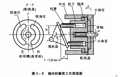 斜盤i頂角為α(定量泵a固定,變量泵α可變),當柱塞隨轉子旋轉時,同時被斜盤推著來回伸縮,檢察后的小油3l容積相應變大或變小。柱塞泵到配流茲的吸油區(qū),其后的小油室容積變大而吸油;柱塞轉到排油區(qū),小油室容積變小往外排油。在兩區(qū)交界處.小油室被密閉.有困油現(xiàn)象。為減少困油的危害,配流盤上開有卸荷糟.
