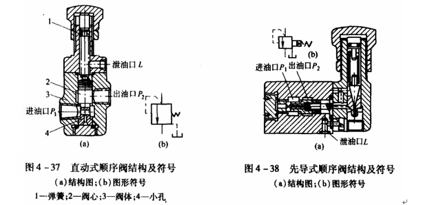 (2)先導(dǎo)式順序閥。圖4-38表示先導(dǎo)式順序閥結(jié)構(gòu)及符號。它的結(jié)構(gòu)與先導(dǎo)式溢流閥的結(jié)構(gòu)基本相同。但先導(dǎo)式順序閥來用單獨的泄油口L。它的工作原理是當(dāng)進油油口(團中未標(biāo))通入壓力油,其液壓力超過彈簧力,使進出油口相通,操縱另一級執(zhí)行元件動作。
