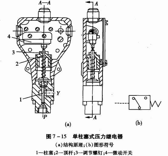 圖7 -15 (a)為單柱塞式壓力繼電器的結(jié)構(gòu)原理圖。壓力油從油口P進(jìn)入,并作用于柱塞1的底部,當(dāng)壓力達(dá)到彈簧的調(diào)定值時(shí),便克服彈簧阻力和柱塞表面摩擦力,推動(dòng)柱塞上升,通過(guò)頂桿2觸動(dòng)微動(dòng)開(kāi)關(guān)4發(fā)出電信號(hào)。圖7 -15(b)為壓力繼電器的圖形符號(hào)。