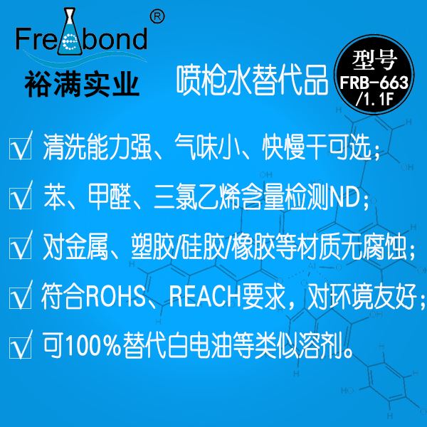 噴槍水替代品|環(huán)保噴槍水|替代噴槍水清洗劑FRB-663/FRB-1.1F裕滿實業(yè)專業(yè)研發(fā)的一種用于替代噴槍水等相似溶劑的環(huán)保清洗劑。