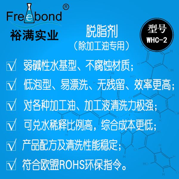 弱堿性脫脂劑|弱堿性除油劑|弱堿性清洗劑|裕滿清洗劑WHC-2是一款以表面活性劑為主要成份的水基清洗劑;本品能夠徹底的清除工件表面的各種加工油、加工液等臟污,具有清洗力強、性能穩(wěn)定、低泡型易漂洗、綜合成本低、不腐蝕材質(zhì)等優(yōu)點。