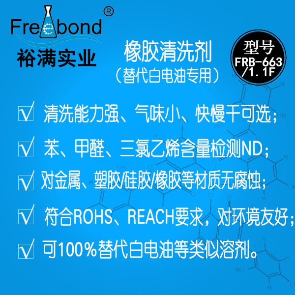 橡膠擦拭清洗劑|橡膠表面擦拭清洗劑|裕滿清洗劑FRB-663/FRB-1.1F是一種用于替代白電油等正己烷類溶劑的環(huán)保清洗劑;本品不僅具有正己烷類溶劑良好的清洗力,還可降低職工正己烷等化學品急性和慢性中毒危害。