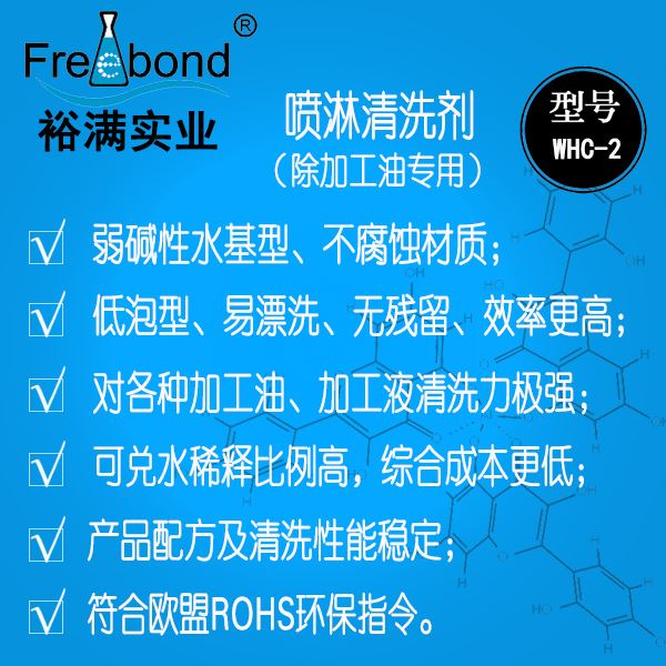 弱堿性噴淋清洗劑|弱堿性噴淋脫脂除油劑|裕滿清洗劑WHC-2是一款以表面活性劑為主要成份的水基清洗劑;本品能夠徹底的清除工件表面的各種加工油、加工液等臟污,具有清洗力強(qiáng)、性能穩(wěn)定、低泡型易漂洗、綜合成本低、不腐蝕材質(zhì)等優(yōu)點(diǎn)。