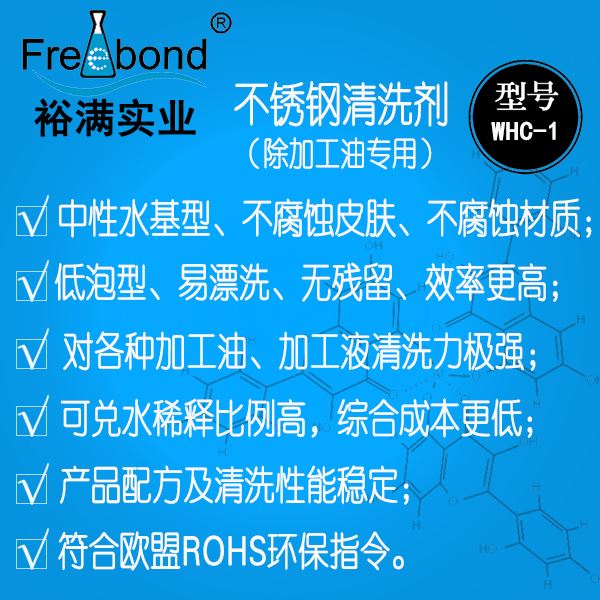 中性不銹鋼清洗劑|中性不銹鋼脫脂除油劑|裕滿清洗劑WHC-1是一款以表面活性劑為主要成份的水基清洗劑;本品能夠徹底的清除工件表面的各種加工油、加工液等臟污,具有清洗力強(qiáng)、性能穩(wěn)定、低泡型易漂洗、綜合成本低、不腐蝕材質(zhì)等優(yōu)點(diǎn)。
