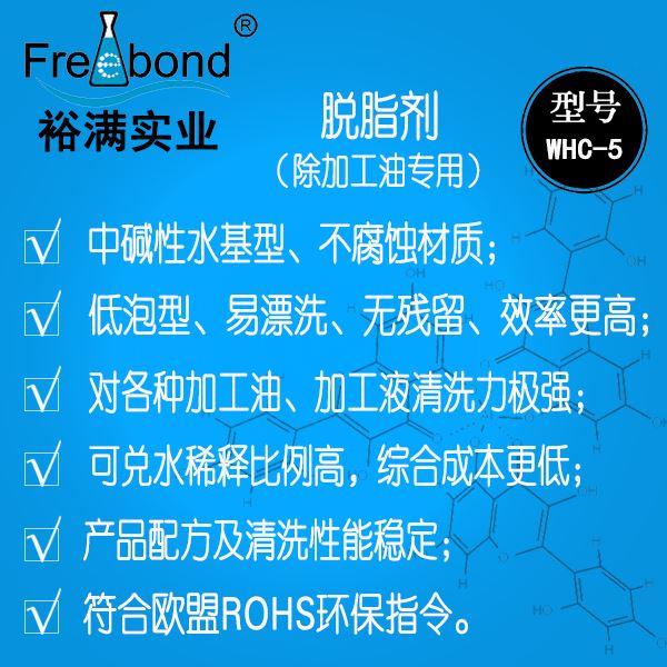 水基堿性清洗劑|水性堿性清洗劑|水基堿性脫脂除油劑|裕滿清洗劑WHC-5是一款以表面活性劑為主要成份的水基清洗劑;本品能夠徹底的清除工件表面的各種加工油、加工液等臟污,具有清洗力強(qiáng)、性能穩(wěn)定、低泡型易漂洗、綜合成本低、不腐蝕材質(zhì)等優(yōu)點(diǎn)。